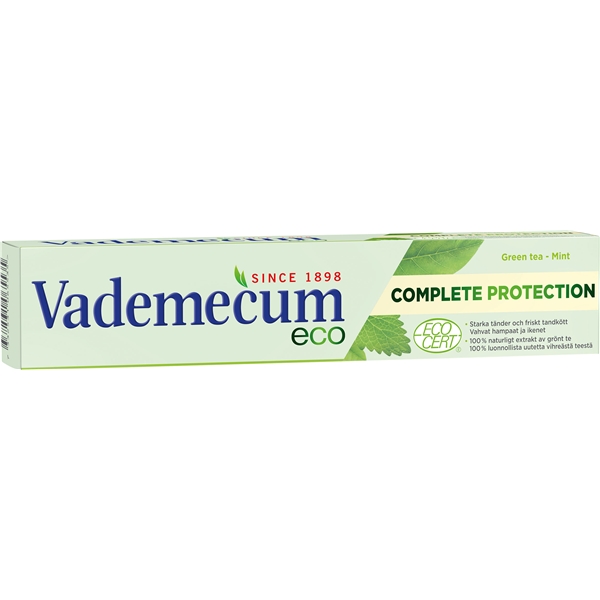 Økologisk og fluorberiget tandpasta som giver stærke tænder og sundt tandkød. Indeholder 99% ingredienser af økologisk oprindelse som er 10% økologisk dyrkede. Tandpastaen er beriget med fluor og naturligt ekstrakt fra grøn te og mynte for at give en effektiv beskyttelse af tænderne. Vademecum Eco Complete Protection er til dig, som vil beskytte både tænder og miljø.