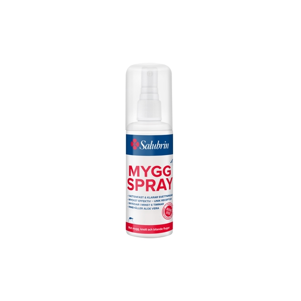 Salubrin Myggspray giver beskyttelse i op til 6 timer. Sprayen er vandfast og kan sprayes på huden eller på tøjet uden at forårsage pletter. Den mindsker også risikoen for stik fra hvepse og bier.