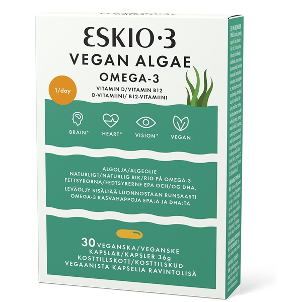 Eskio-3 Vegan Algae er en algeolie, som er naturligt rig på Omega-3-fedtsyrerne EPA og DHA. Den gavnlige effekt for at bidrage til hjertets normale funktion opnås ved en daglig indtagelse på 250 mg EPA og DHA, hvilket modsvarer 1 kapsel. Den gavnlige effekt for at bidrage til hjernens og synets normale funktion opnås ved en daglig indtagelse på 250 mg DHA. Eskio-3 Vegan Algae indeholder desuden vitamin D og vitamin B12.