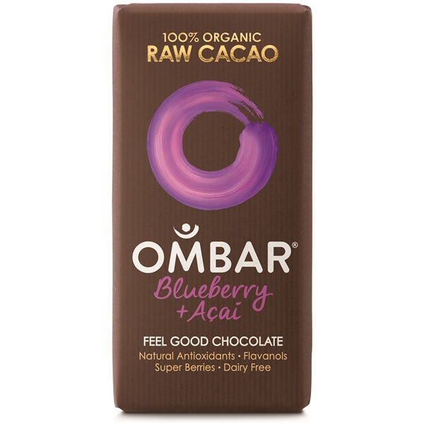 Fra Ombar kommer en fin serie med økologisk equadoriansk råchokolade. Chokoladen indeholder spændende superfrugter, bær og sunde bifidusbakterier. De små nyttige chokolader vejer 35 g og er sødet med uraffineret kokossukker (lavt GI). Ombar smager himmelsk og har en cremet og trøffelagtig konsistens, som smelter i munden. I denne chokolade blandes superfrugterne acai og blåbær til en sød og næringsrig smagssensation.