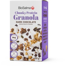 Biosalmas chunky protein granola er en udsøgt måde at starte dagen på. En kombination af grove chunks lavet på ovnristede havregryn med stykker af fyldig mørk chokolade, sammen med sprøde græskarkerner.