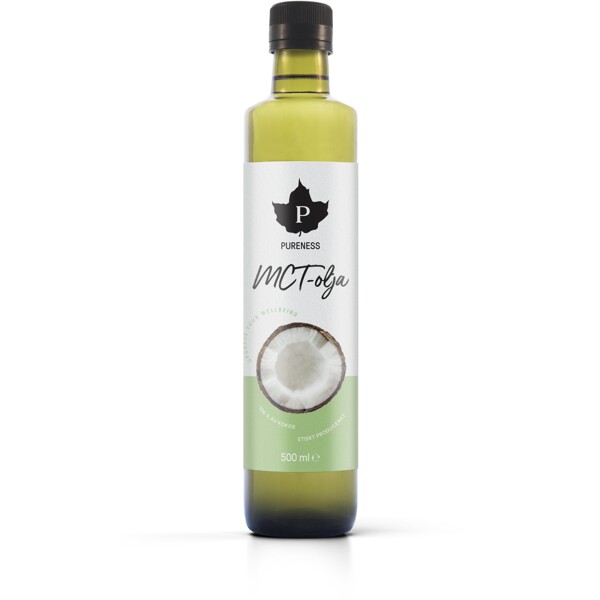 Pureness MCT-olie 500 ml er en højkvalitets fraktioneret kokosolie med mellemlange fedtsyrer. Navnet MCT kommer fra Medium Chain Triglycerides. MCT er antiinflammatorisk og antioxidant, og netop MCT-olie fra kokos er populært inden for LCHF. Tag gerne en teskefuld i kaffen om morgenen!