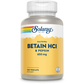SOLARAY BETAIN HCI & PEPSIN indeholder enzymet pepsin og betainhydrochlorid (saltsyre). Anvendes efter behov i forbindelse med måltider.Betain bidrager til normal homocysteinomsætning. Homocystein er en aminosyre, der dannes fra methionin og påvirkes af ernæring og genetik. Høje niveauer i blodet er associeret med øget risiko for helbredsproblemer. Betain hjælper med at reducere homocysteinniveauerne ved at fungere som methyldonor og støtte methyleringsprocessen.
