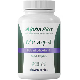 Metagest består af en blanding af betainhydrochlorid og pepsin. Betainhydrochlorid har en lav pH-værdi. Pepsin er et enzym med en molekylvægt på 34,6 kDa, og det er aktivt i en sur miljø (pH-optimum 1,5-2,0).