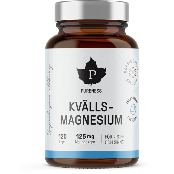Pureness Aftenmagnesium er et kosttilskud med magnesium og urteekstrakt, der er udviklet til at bidrage til bedre søvn og afslapning! Perfekt til dig, der måske føler dig stresset eller har søvnproblemer.Magnesiumformen er magnesiumbisglycinat, en magnesiumform der er kendt for at være meget mavevenlig, have høj absorptionskapacitet samt have en beroligende effekt, da aminosyren glycin, som er bundet til magnesiumet, fungerer som en beroligende neurotransmitter i kroppen.