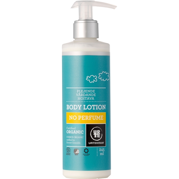 Body Lotion fra Urtekram’‘s komplette hudplejeserie uden parfume, med regenererende abrikoskerneolie, fugtighedsbevarende kokosolie og plejende sheasmør. Urtekram No Perfume anbefales til personer som får allergiske reaktioner når de anvender parfumerede produkter, eller til personer der vil minimere risikoen for at udvikle allergi og overfølsomhed. Ren økologisk kropspleje. Intet andet.