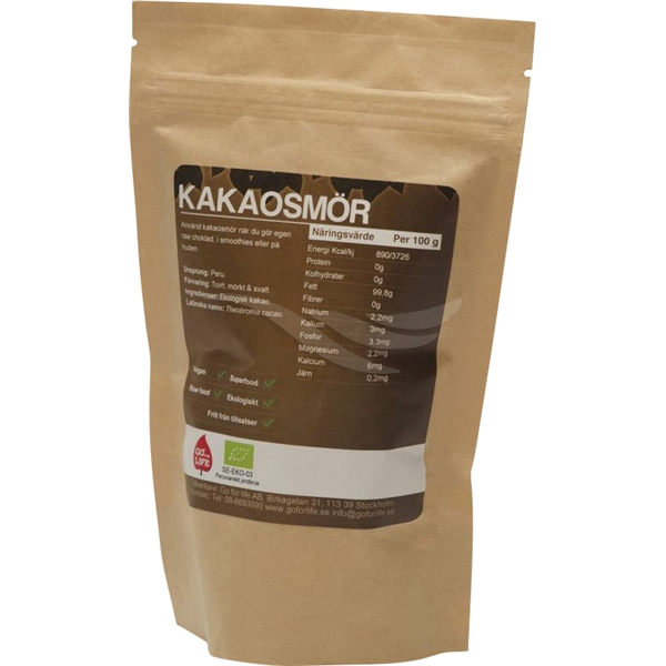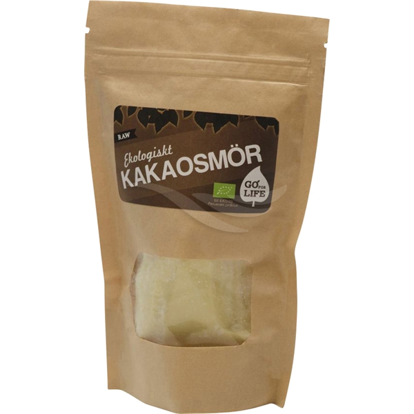 Økologisk koldpresset kakaosmør. Kakaosmør er fedt fra kakaobønnen, som blandt andet anvendes ved fremstilling af chokolade.Kakaosmør fremstilles ved at kakaomassen presses så fedtet adskilles. Oftest opvarmes kakao ved fremstillingen, og det gør at den mister en vigtig del af sin næringsværdi. Hvis man ønsker at drage fordel af alle mineraler, vitaminer og antioxidanter skal kakaoen derfor spises rå og ubehandlet. En standardingrediens i det meste chokoladebagværk såsom chokoladekager, chokoladekugler og chokoladepraliner. Kakaonibs og kakaobønner er også gode at anvende i mysli, på grøden, på yoghurten eller i nødde-, bær- og frugtblandinger.