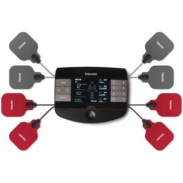 - 2 varmeindstillinger: Lav og høj- 4 kanaler: Intensitetsniveauerne kan justeres individuelt- 6 tilpasselige programmer: Programmerbar frekvens, pulsbredde, tænd/sluk-tid- 4-i-1-funktion: TENS, EMS, massage, varme- Elektrisk muskelstimulation (EMS) til muskeltræning og regenerering- Varmefunktionen kan aktiveres til smertebehandling og muskelstimulation eller anvendes helt separat- Transkutan elektrisk nervestimulation (TENS) til smertelindring uden medicin- 8 elektroder til omfattende behandling