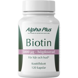 Alpha Plus Biotin 5000 µg er et højdoseret tilskud med vitamin B7 (biotin), et næringsstof der bidrager til at opretholde normalt hår, normal hud og normale slimhinder. Biotin spiller også en vigtig rolle for normal psykologisk funktion og nervesystemets normale funktion. Hver kapsel indeholder 5000 µg biotin og passer til dig, der ønsker at give ekstra støtte til hår og hud.
