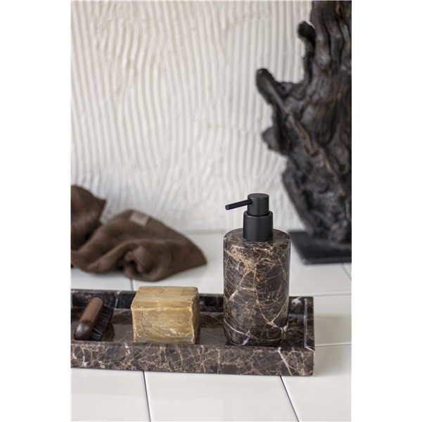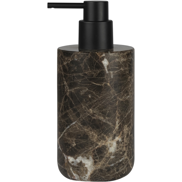 Dispenseren fås i to udgaver og har en sort ABS-pumpe. Du kan kombinere dispenseren med de andre produkter fra Marble-serien i form af tandbørsteholder, bakke og lysestage.