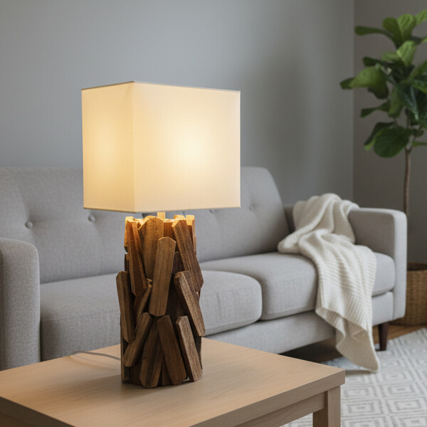 Unik Design: Har en distinkt base skabt af sammenkædende teaktræstykker, kompletteret med en ren, rektangulær stofskærm.