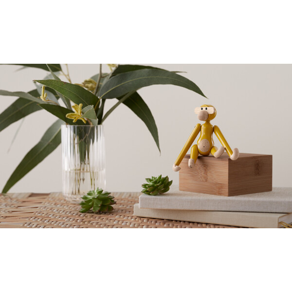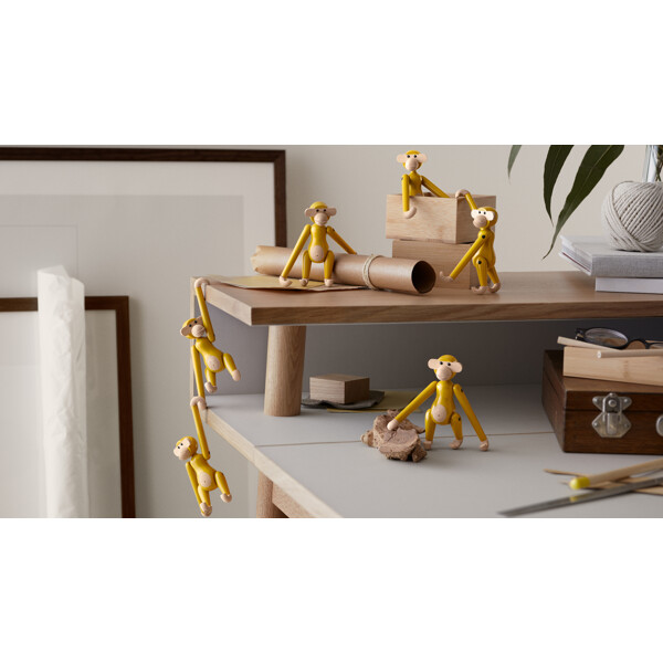 En farverig original med et nostalgisk og nyskabende look. Kay Bojesens ikoniske abe er en kendt og elsket humørspreder blandt både store og små. Med miniaben af bøgetræ der er malet i originalfarver fra arkiverne bliver glæden endnu større! Den farvede miniversion er inspireret af farverne på et originaltapet, som Kay Bojesen designede til børneværelser i slutningen af 1940’erne. Det er nemt at fornemme de originale retro-vibes i de afdæmpede farver, som smukt fremhæver bøgetræets kølige udtryk. Aberne er 9,5 cm høje og fremstillet af FSC®-certificeret bøgetræ, som ses på hænder og fødder, mens ansigtet og maven giver den nye miniabe en lidt kæk og ungdommelig karakter. De malede miniaber sprudler af glæde og opfindsomhed og sætter de oprindelige fortællinger fra Kay Bojesen i en ny kontekst på en smuk og selvsikker måde. Samtidig forbliver figuren ikonisk takket være de klassiske farver fra Kay Bojesens oprindelig univers, der gør miniaben perfekt som et legesygt element i en moderne indretning. Den lokker smilet frem på læben og skaber en unik stil med sin finurlige fremtoning og sit farverige udseende, og det gælder uanset hvor i huset den flytter ind. Et musthave for designelskeren som har alt! Eller til os som ikke kan få nok af Kay Bojesens aber og deres hyggelige selskab.