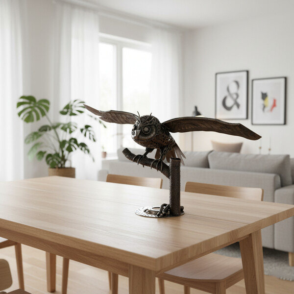 Forøg din indretning med den fængslende tilstedeværelse af denne utrolige, 100 % håndlavede metalskulptur af en flyvende ugle! Dette er ikke blot en dynamisk dekoration; det er et ægte kunstværk, omhyggeligt fremstillet af genanvendt metal, hvilket gør det til et bæredygtigt og helt fascinerende tilføjelse til ethvert hjem, kontor eller lokale.