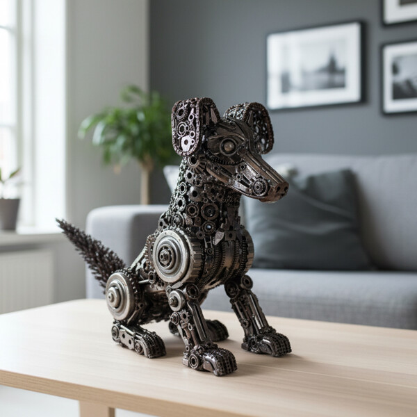 Giv dit rum charme med vores håndlavede Gear Pup-skulptur, skabt af genanvendt metal af dygtige håndværkere. Hver del fortæller en historie om forvandling, med legende detaljer som nysgerrige øjne og en logrende hale. Denne unikke metalhundeskulptur kombinerer rustik industriel stil med dele fra genbrugsmaterialer, hvilket gør den til en fortryllende samtalestarter og et symbol på bæredygtig kunst. Perfekt størrelse til at tilføre karakter til ethvert hjem, den indkapsler glæde og kreativitet.