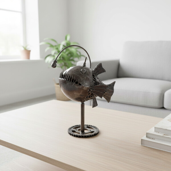 Vores dygtige håndværkere har forvandlet genbrugsmateriale til en fængslende og fantasifuld præsentation af dybhavsfisken Angler Fish, komplet med dens ikoniske lysende lokkemad. Hver pig, hver tand og dens karakteristiske lys er formet, hvilket skaber en virkelig unik skulptur, der kombinerer industriel design med mystisk undervandscharme. Den robuste, tandhjulsinspirerede base garanterer stabilitet og bidrager til dens unikke karakter.