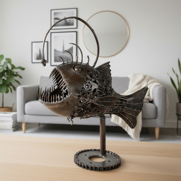 Vores dygtige håndværkere har forvandlet genbrugsmaterialer til en fængslende og fantasifuld præsentation af den mystiske anglerfisk. Hver pig, hver tand og dens ikoniske lokkemad er skulptureret, hvilket skaber en virkelig unik skulptur, der kombinerer industriel design med dybhavets vidundere. Den robuste, tandhjuls-inspirerede base garanterer stabilitet og bidrager til dens distinkte charme.