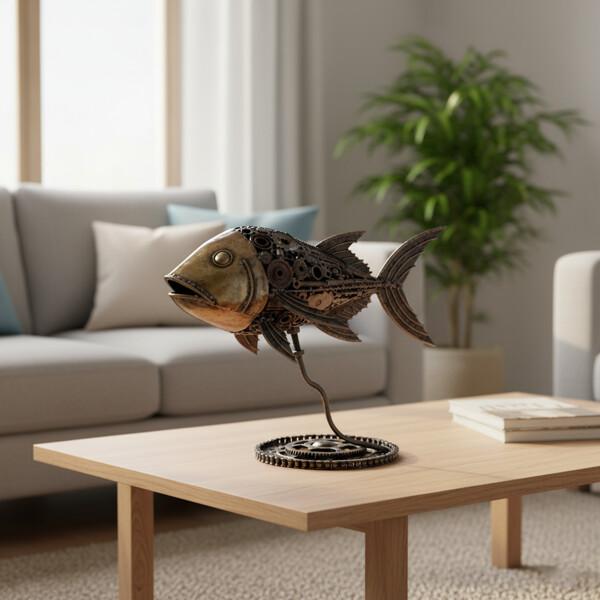 Vores dygtige håndværkere har forvandlet genbrugsmaterialer til en fængslende og detaljeret repræsentation af den alsidige Jack Fish. Hvert tandhjul, skrue og metalkomponent er gennemtænkt, hvilket skaber en unik skulptur, der viser de kunstneriske muligheder med genbrugsmaterialer. Den robuste, industrielt inspirerede base komplementerer fisken perfekt og tilfører stabilitet og et strejf af rå elegance.