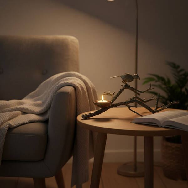 Før en touch af naturinspireret kunstneriskhed og varm atmosfære ind i dit hjem med denne udsøgte håndlavede metalskulptur. Omhyggeligt formet af metal, har den en charmerende fugl, der elegant sidder på en gren, sammen med en lille, integreret skål perfekt til at holde et lys eller små skatte. Dette 100% håndlavede værk er et bevis på unikt håndværk, som tilfører sofistikeret charme og et blødt skær til ethvert miljø.