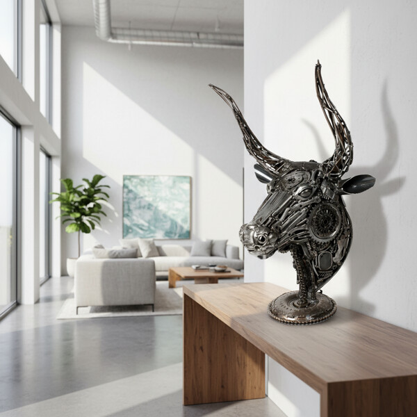 Slip løs en kraftfuld kunstnerisk åre i dit hjem med vores imponerende tyrehuvud skulptur! Dette ekstraordinære værk er et sandt resultat af rå styrke og holdbart design, og er 100 % håndlavet af dygtige håndværkere fra genbrugt metal. Hver detalje fra dens imponerende horn til dens beslutsomme blik fortæller en unik historie om forvandling, der omdanner overskydende komponenter til et forbløffende kunstværk.