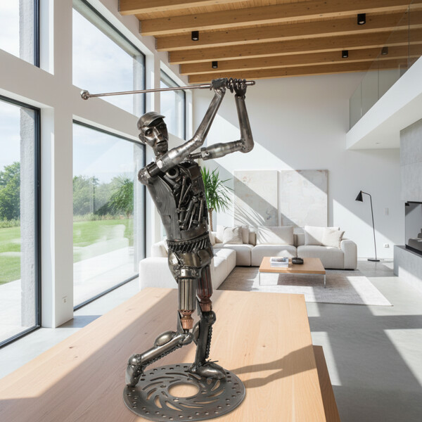 Fejr din kærlighed til golf med vores håndlavede golfspiller skulptur, fremstillet af genbrugt metal af dygtige håndværkere. Dette detaljerede værk forvandler efterladte komponenter til et levende symbol på engagement og sport. Dens perfekte størrelse gør den ideel til skrivebord eller hylder, hvor den kombinerer en industriel æstetik med rige detaljer. Mere end blot dekoration, hylder den spillet og fremviser bæredygtigt håndværk, hvilket appellerer til både golfentusiaster og kunstbeundrere.