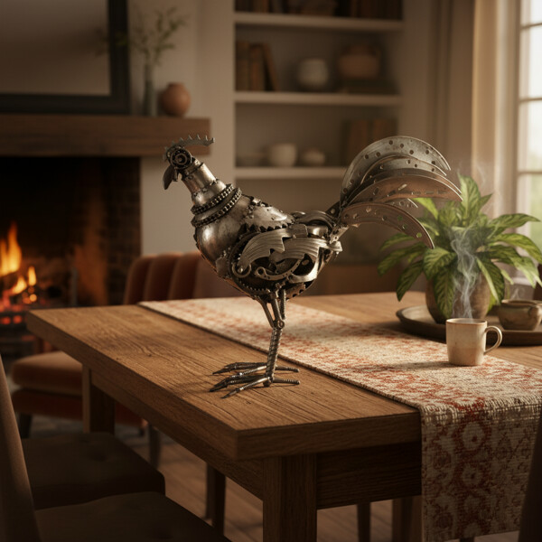 Vores dygtige håndværkere har forvandlet genbrugsmaterialer og på en smart måde integreret tandhjul, kæder og forskellige metaldele for at skabe en storslået og detaljeret repræsentation af en stolt hane. Hver fjer i dens imponerende hale, dens stærke holdning og dens statelige kam er omhyggeligt integreret, hvilket skaber en virkelig unik skulptur, der kombinerer industriel æstetik med livlig bondegårdscharme.