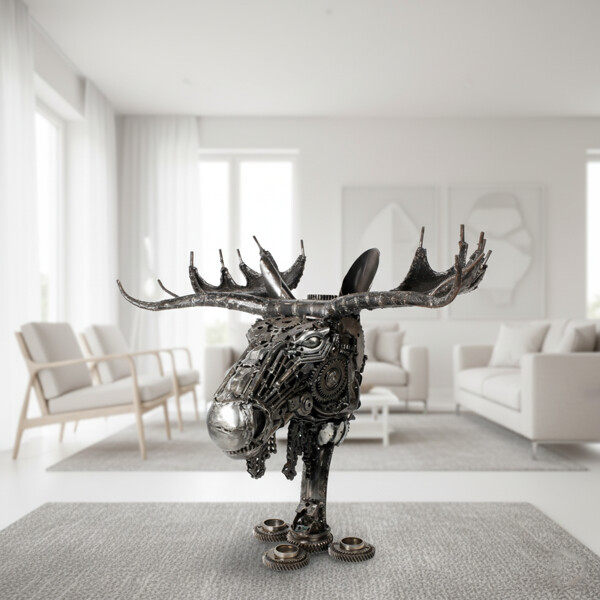 Gør et uforglemmeligt indtryk med vores Håndlavede Elgkranium i Metal, et virkelig bemærkelsesværdigt og 100% håndlavet kunstværk. Dette fængslende elghoved er dygtigt sammensat af genbrugt metal, hvilket forvandler kasserede komponenter til en kraftfuld og værdig repræsentation af en af naturens mest ikoniske skabninger.
