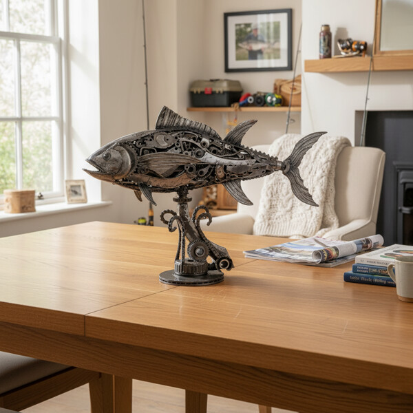 Vores dygtige håndværkere har forvandlet genbrugsmaterialer til en kraftfuld og detaljeret repræsentation af den mægtige tunfisk. Hver komponent, fra de indviklede tandhjul til de elegante linjer på dens krop, er gennemtænkt placeret, hvilket skaber en virkelig unik skulptur, der fanger essensen af denne hurtiggående fisk.