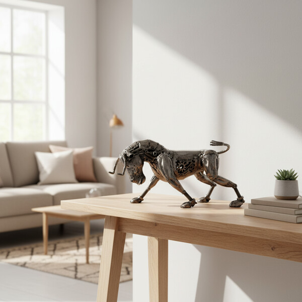 Vores dygtige håndværkere har forvandlet genbrugsmateriale til en dynamisk og detaljeret præsentation af en angribende tyr. Hver muskel, hver kurve af dens horn og dens beslutsomme holdning er gennemtænkt, hvilket skaber en virkelig unik skulptur, der kombinerer råstyrke med indviklet industriel æstetik.