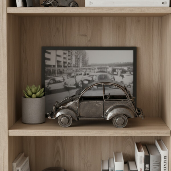Tag på en nostalgisk rejse med vores Vintage Beetle-skulptur, et 100% håndlavet kunstværk fremstillet af genbrugt metal. Denne unikke skulptur har detaljer, fra klassiske forlygter til døre, der kan åbnes, og er en lille del af bilhistorien.