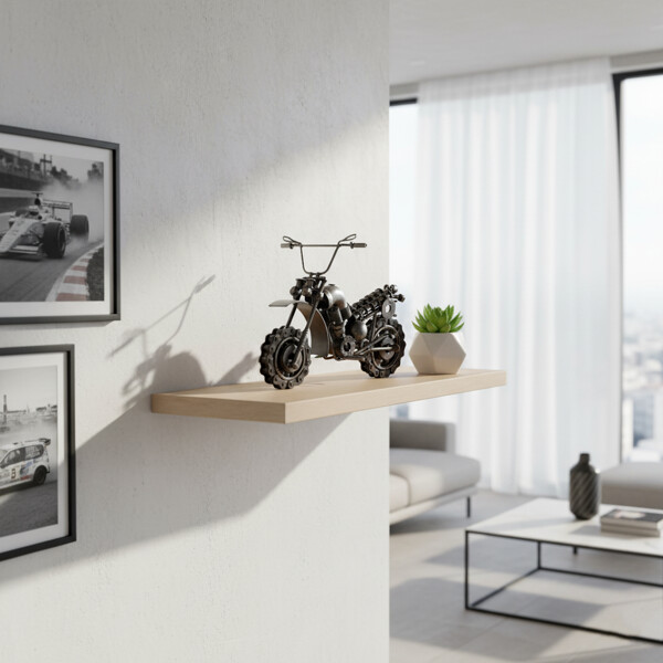 Tilfør hjemmet spændende motocrossenergi med vores håndlavede motocrossmetalskulptur, et unikt 100 % håndlavet kunstværk. Dens kompakte størrelse passer til enhver indretning og tilføjer en kantet industriel charme. Af metalfragmenter og kæder skabes en fængslende tekstur, der fremviser håndværkerens talent. Den er perfekt til at forstærke karakteren og den mekaniske skønhed i dit hjem eller kontor.
