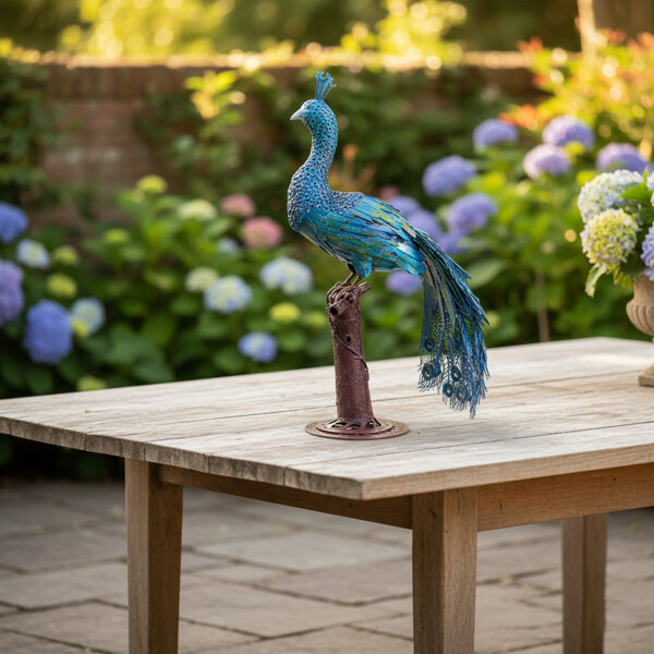 Forny dit hjem med vores håndlavede påfuglemetalskulptur, et fantastisk 100% håndlavet værk fremstillet af genbrugsmetal. Den elegante skulptur, med lag og livlige blå og grønne nuancer, tilfører eksotisk charme og kunstnerisk stil til enhver indretning.