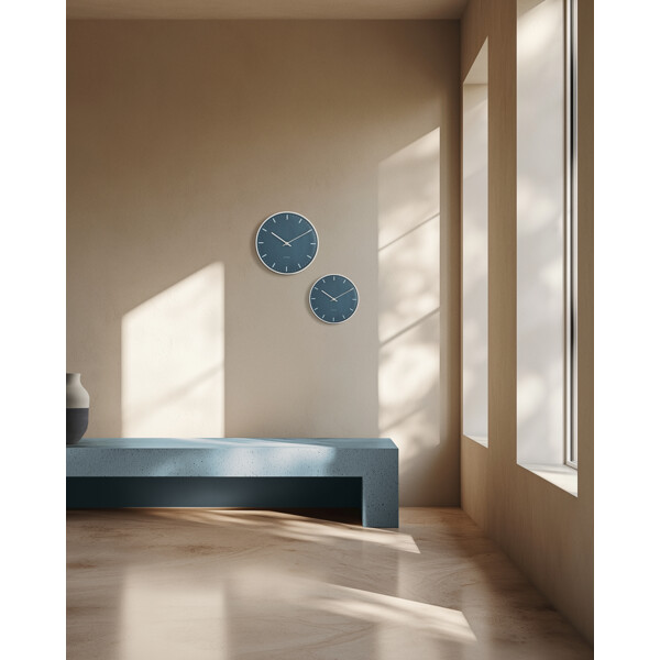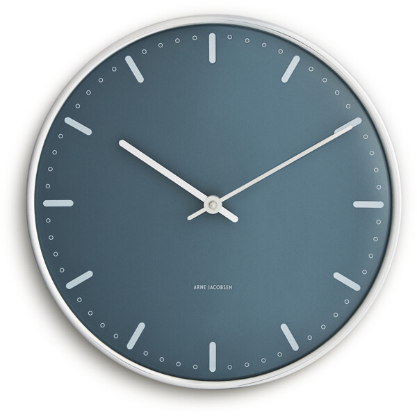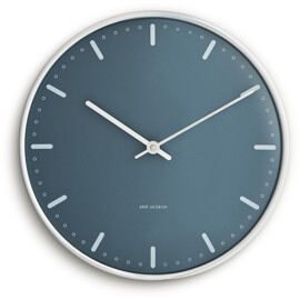 Funktionalisme. Enkelhed. Arne Jacobsen. City Hall-væguret fra Arne Jacobsen Clocks er design i sin reneste form – skabt til at vise tiden, og intet andet. Arne Jacobsen mente, at et ur skulle opfylde en enkel funktion uden unødvendige forstyrrende elementer. Med denne eksklusive udgave af hans klassiske City Hall-vægur – nu i nye, moderne farver fra Arne Jacobsens egen farvepalet på både urskive og urkasse – får City Hall et helt nyt, men stadig minimalistisk udtryk, tro mod sit ophav og Arne Jacobsens designvision. City Hall-uret blev oprindeligt skabt til Rødovre Rådhus, hvor det indgik i arkitektens helhedskoncept for det nye rådhus, der blev færdiggjort i 1956. Designet er tidløst, klassisk og helt enkelt – men samtidig karakteristisk. Med sit svævende udtryk på væggen hænger City Hall-væguret næsten som en skulptur i hjemmet, som en elegant repræsentant for det bedste inden for dansk design. Dette City Hall-vægur leveres med blå urskive, mens urkasse, visere og timemarkeringer er i en blank sølvfinish, der udstråler eksklusivitet. Brug det i klassisk indretning som et funktionelt designelement med stærk visuel tilstedeværelse. Og selvom uret har fået en farveopdatering, er det stadig Arne Jacobsens unikke formsprog, der tydeligt træder frem – og skaber en spændende kontrast mellem de klassiske former og den nytænkende farvesætning fra Jacobsens store designarkiv. Elementer, der giver uret masser af karakter – et diskret statement, der aldrig forstyrrer rummet. Alligevel får du med et ur fra Arne Jacobsen Clocks et designikon, der kan løfte eller fuldende ethvert rum. Arne Jacobsen troede på at reducere, ikke tilføje. På at lade formen følge funktionen. Et princip, der ikke kun lever i designet, men også i, hvordan vi vælger at bruge vores tid. Som en af det 20. århundredes mest indflydelsesrige danske arkitekter og designere satte Arne Jacobsen sit modernistiske præg på arkitektur og design i over 50 år – ikke kun i Danmark, men også internationalt. Hans kompromisløse syn på design og formgivning har resulteret i den ene designklassiker efter den anden, som findes både på museer og i utallige private hjem, hvor de er en naturlig del af hverdagen. Som arkitekt og forbillede tilegnede han sin karriere til at finde ind til kernen og tænke nyt omkring produkter og strukturer ud fra et funktionelt, minimalistisk perspektiv. En tilgang, der selvfølgelig også præger Arne Jacobsen Clocks design i dag. Tiden går. Design består. Naturligvis skal et ur vise tiden. Men hvorfor ikke bruge dit ur fra Arne Jacobsen Clocks til at skabe bevidste pauser – i din egen tid? Brug det som en påmindelse om at sænke tempoet og fokusere på det, der virkelig betyder noget. Din tid. Uden afbrydelse. For med det ikoniske City Hall-vægur fra Arne Jacobsen Clocks er tiden også tidløs – et universelt urdesign, kompromisløst og elegant. Forever keeping up with time.
