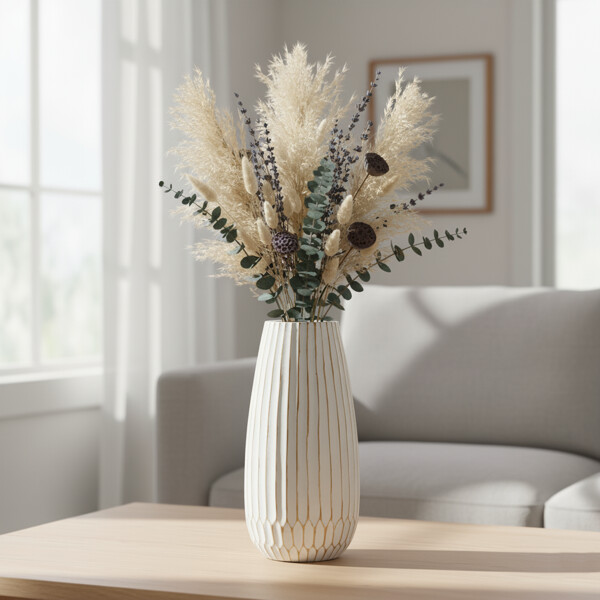 Unik tekstur: Har en smuk tekstureret overflade med vertikale riller og et nedre mønster, ideel til at tilføje en organisk elegance til din indretning.