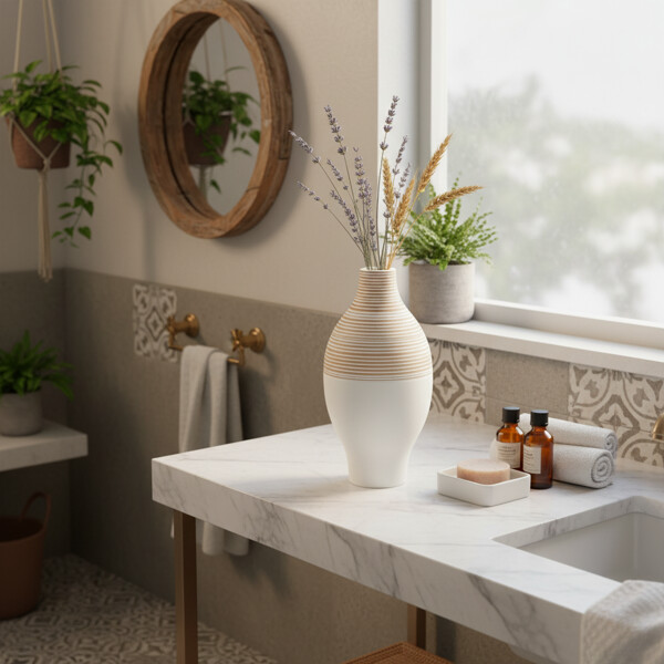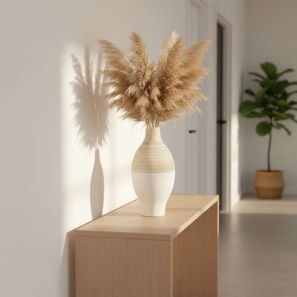 Slående design: Har et fængslende tofavet og horisontalt stribet mønster, ideelt til at tilføje en moderne, men alligevel organisk æstetik til din indretning.