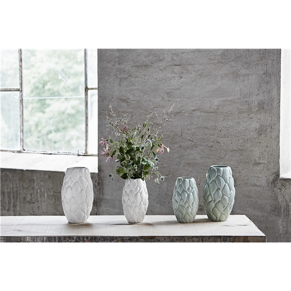 Leaf-vasen er designet af Peter Svarrer, der er en af de bedste og mest anerkendte keramiske designere i Danmark. Naturligvis er Leaf-vasen skabt med inspiration fra blade, men her er det i form af den mest stilistiske og skulpturelle form. Side ved side skaber vaserne en uberørt skovbund af blade, hvor den smukke glasur indfanger lyset og fremhæver bladets struktur. Denne smukke vase fra Knabstrup Keramik fås i flere størrelser og farver. Materiale: keramik Størrelse: 21 cm Knabstrup Keramik fokuserer på kvalitet, og firmaets keramik kan bevares i mange år hvis du følger nogle få enkle råd: Vask keramikken af i hånden med et mildt opvaskemiddel og anvend aldrig ståluld ved rengøring. For at keramikken skal kunne ånde skal den opbevares og tørres med bunden i vejret, eftersom den ellers kan afgive fugt på grund af vandabsorbering.Det anbefales altid at du sætter møbelsko under vaser og urtepotter for at forhindre at der dannes kondensvand, som kan afgive fugtpletter på møbler m.m. Anvend aldrig lys uden folie og placér altid lysestager på en ikke brændbar overflade. Der vil forekomme variationer i farve og form, og det er netop dette, der er en del af charmen ved kunsthåndværk.
