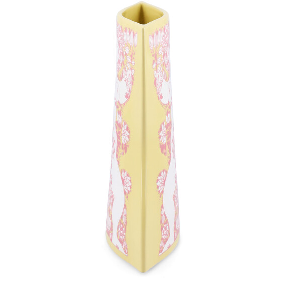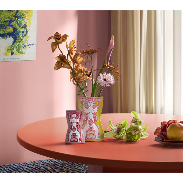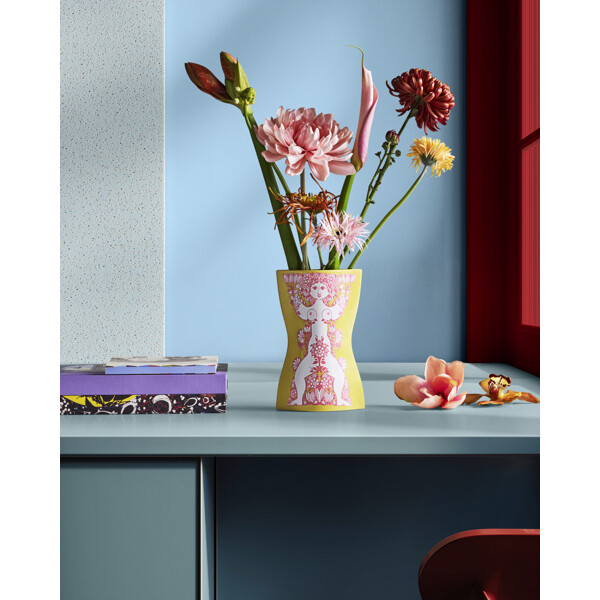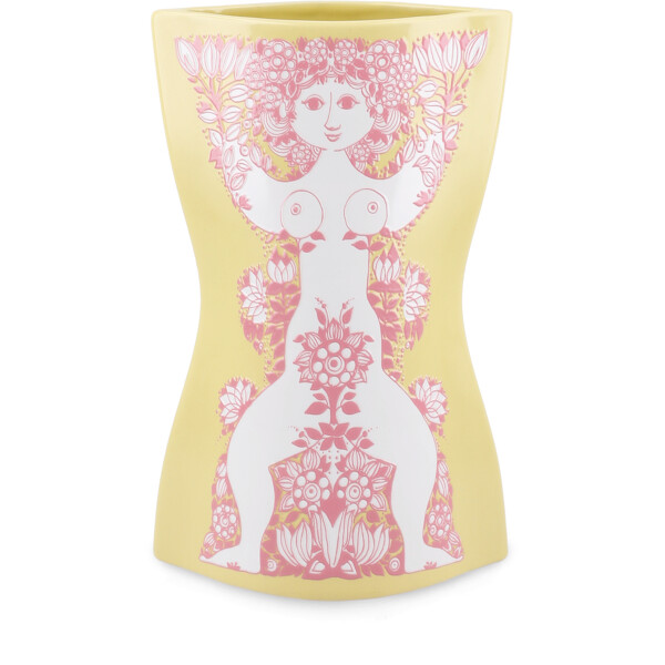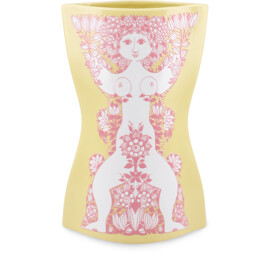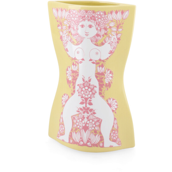Et farverigt kunststatement til dit hjem. Med Nina-serien fra Bjørn Wiinblad får du en dristig og kunstnerisk fortolkning af kvindekroppen i keramik, der hylder former, frihed og glæde med ikoniske linjer og en levende farvepalet. Et visuelt kraftfelt baseret på originale kunstværker, der løfter rummet – og humøret. Nina er ingen klassisk vase. Det er kunst i brugbar form, skabt med inspiration fra Bjørn Wiinblads imponerende designarkiv, hvor en kvindeskikkelse fortolkes med stærk grafisk identitet og skulpturel silhuet – dekoreret med farverig, blomstrende botanik i forhøjede dekaler, der både kan ses og føles. Dette er Bjørn Wiinblad, når han er modigst og mest poetisk. De bølgende former og sensuelle detaljer står som et kreativt svar på minimalismen – med et udtryk, der sprudler af liv, legesyge, styrke og stolthed. Nina er en hyldest til kvindekroppen. En hyldest til individualitet. Og en kærlig opfordring til at være sig selv – uden filter, uden kompromisser. Nina-vasen med en højde på 22 cm er præget af en frisk gul tone i kombination med kvindeskikkelsen omgivet af en overdådighed af dekorative lyserøde detaljer. En farverig åbenbaring af poesi, personlighed og power, der smukt spiller sammen med Ninas unikke karakter – den bølgende form – som både fremhæver kvindemotivet og skaber visuel balance. Nina hylder former, frihed og glæde – med en sommerlig og optimistisk farvepalet, en legesyg form og et imponerende grafisk udtryk, særligt kendetegnet ved det centrale kvindemotiv, hvis blomsterkrone og vinger næsten smelter sammen i en symmetrisk komposition, der er både sensuel og kraftfuld. Alt er overført som farvet dekal på blankglaseret keramik med forhøjet mønster, hvilket giver en unik taktil oplevelse. Uanset hvilken Nina-vase du vælger, vil den give dit hjem en unik blikfanger og kunstnerisk finesse, der både kan rumme den smukkeste buket eller stå alene – helt nøgen. Og udstråle den dybeste kærlighed til alt det, der gør os til dem, vi er. Bjørn Wiinblad var en livsglad kunstner med en stor og farverig personlighed, der ikke var bange for at tænke stort, være anderledes – og hylde skønheden i det, der skiller sig ud. Den sjæl lever fuldt ud videre i Nina, som med sin drømmende udstråling og farverige styrke inviterer os til at gøre plads til glæde – og til at være os selv.