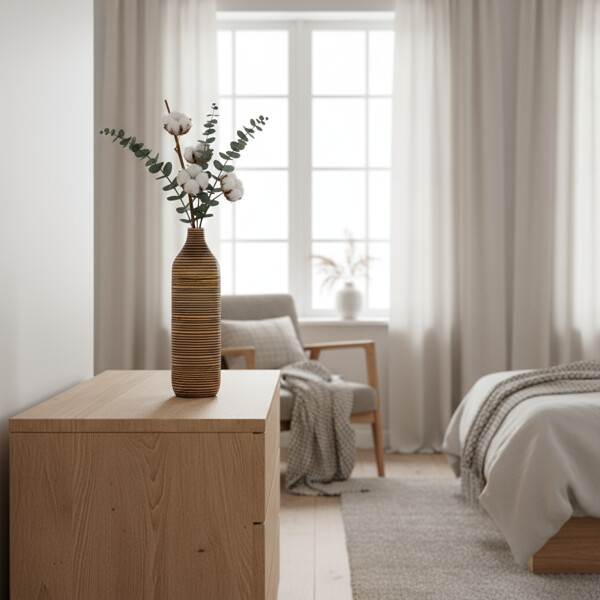 Iøjnefaldende design: Har et fængslende horisontalt stribet mønster, ideelt til at tilføre en moderne men alligevel organisk æstetik til din indretning.