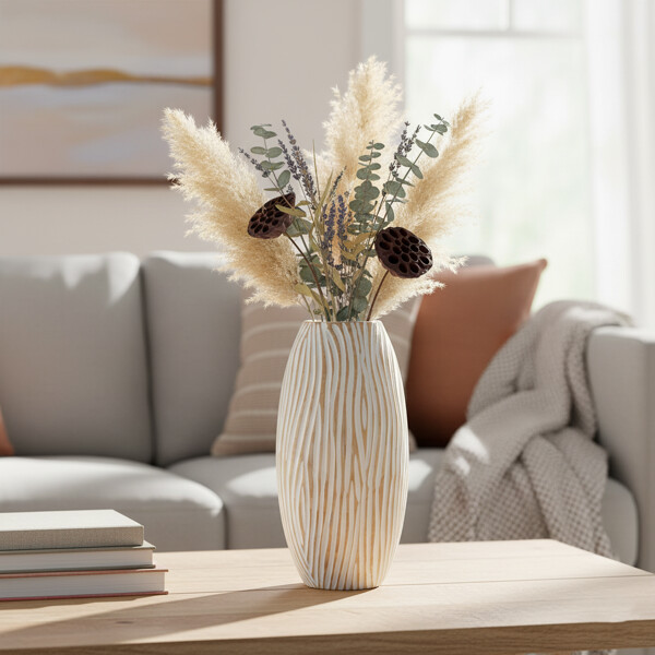 Forøg din indretning med den organiske skønhed og det håndværksmæssige charme fra denne unikke håndlavede dekorative trævase. Omhyggeligt fremstillet i Thailand, har den en bølget vertikal rillet overflade i hvid, der viser det naturlige træ under, hvilket skaber en fængslende visuel oplevelse. Denne miljøvenlige vase er et resultat af ægte håndværk, perfekt til at forbedre dit hjem med bæredygtig kunstneriskhed og moderne tiltrækning.