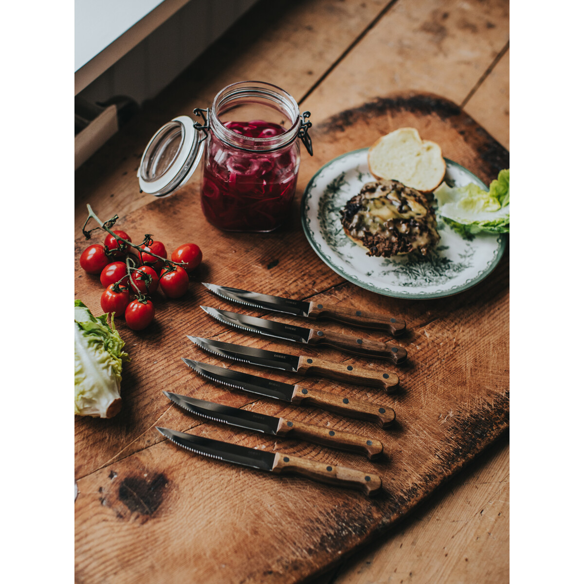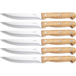 BBQ steakknive i 6-pak leveres i trækasse og har blade i rustfrit stål samt håndtag i akacietræ. Med deres længde ligger de stabilt i hånden og skærer kød med lethed. Et rustikt og stilfuldt sæt, der løfter grillaftenen og giver en premiumfølelse ved hvert snit.