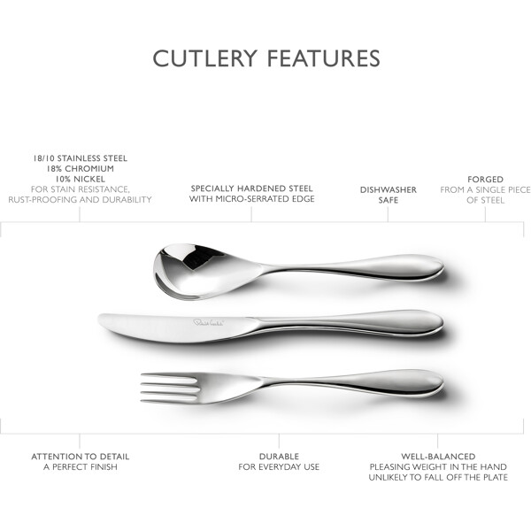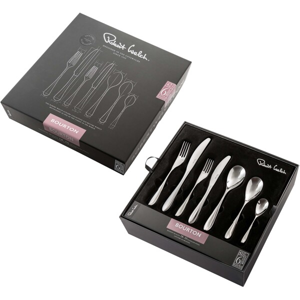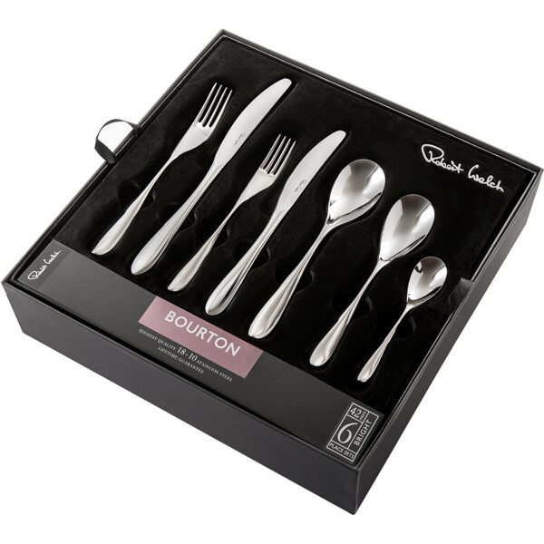 Bourton bestikserie i 42 dele fra Robert Welch, inspireret af den snoede flod, der løber gennem den pittoreske landsby Bourton on the Water. Med sin bløde og elegante profil bliver bestikserien hurtigt en favorit. Skeer og gafler er fremstillet af højeste kvalitet 18/10 rustfrit stål. Knivblade er lavet af specielt hærdet rustfrit stål for at give den bedst mulige skærekant.