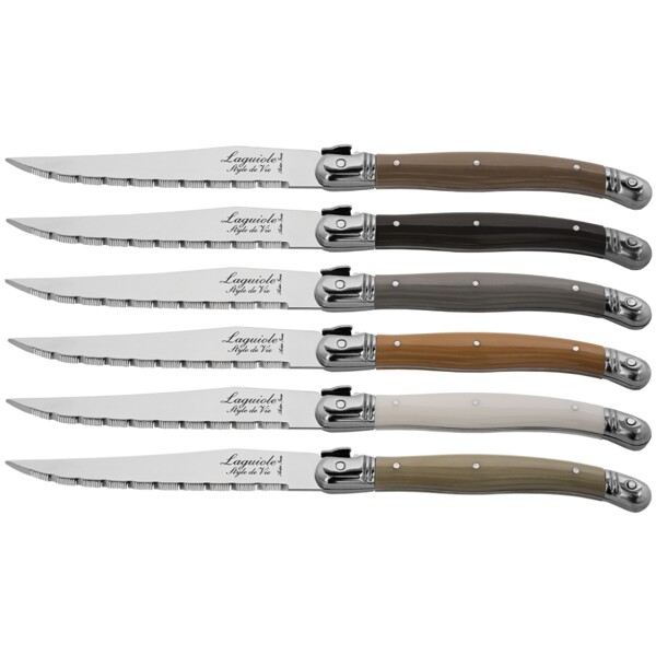 Med disse grillknive Treasure i sæt af 6 stk. fra Premium Line of Laguiole Style de Vie skærer du nemt et godt stykke kød. Grillknivenes takkede blade er lavet af rustfrit stål. Bladet har en tykkelse på 1,8 mm og tåler opvaskemaskine. Hvert sæt kommer i en praktisk træblok. Grillknivene i Premium Line fås også i mange andre farver og materialer.