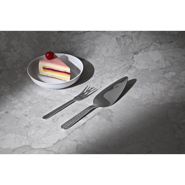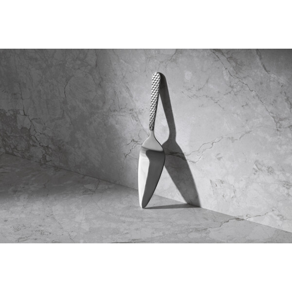 Skab harmoni i din borddækning med den ikoniske Rhombe-signatur. Med en Rhombe-kagespade fra Lyngby Porcelæn kan du nu opnå en unik helhed mellem alle Rhombe-serierne og nyde den ekstra dybde og taktile fornemmelse, som en smuk kagespade i 100 % genanvendt stål giver. Kagespaden er 25,5 cm lang og er designet til at harmonere med detaljerne i Rhombe-porcelænet, så du kan skabe præcis den følelse af luksus, der gør hver lille lækkerbisken til en sublim oplevelse for sanserne. Sammen med resten af Rhombe-bestikket kan du både forvandle hverdagen til noget særligt og gøre hver festlig begivenhed uforglemmelig med fuldendt stil og finesse. Det velkendte grafiske Rhombe-mønster pryder naturligvis skaftet og er hævet som en lav relief – præcis som på de andre bestikdele og seriens porcelænsdele. Det er ikke kun smukt og stilrent, men giver også en udsøgt taktil fornemmelse i hånden, når du bruger kagespaden. Med en Rhombe-kagespade får du et strømlinet og eksklusivt design, der indbyder til at gribe håndtaget og mærke reliefen i hånden, samtidig med at den elegant forlænger Rhombe-mønsteret ud på det mest eksklusive kagebord. Den blanke finish forstærker Rhombe-mønsterets visuelle dybde, som straks fanger øjet og skaber et unikt blikfang, du kun får med det oprindelige Rhombe-design. Med en smuk finish og et lille diskret logo præget i det polerede stål matcher den både det klassiske hvide Rhombe-stel, Rhombe Earth-kollektionen og Rhombe Color-delene. Som noget helt nyt bidrager den til at udvide hele Rhombe-seriens mange porcelænsdele med et nyt smukt og naturligt materiale, som lader det diskrete mønster træde frem på en ny måde – og hvor kontrasten mellem det bløde formsprog og den stramme Rhombe-relief gør mønstrets former endnu tydeligere og skaber fokus.