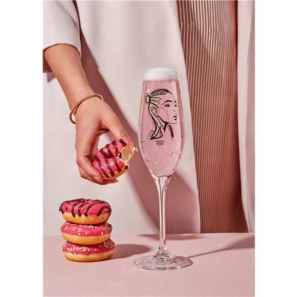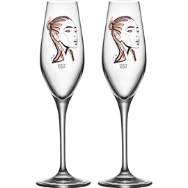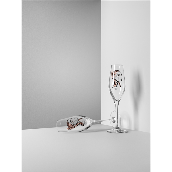Champagneglas fra den populære og ungdommelige glasserie All About You fra Kosta Boda. Serien er designet af kunstnerinden Sara Woodrow, hvor illustrationerne på glassene er inspireret af modeverdenen. Champagneglassene leveres i en pakke med 2 stk.