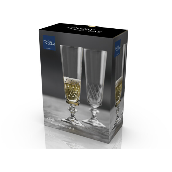 Eaton champagneglas, 16 cl, fortolker det klassiske diamantformede mønster fra det ikoniske Eaton-glas, som Lyngby Glas skabte i 1960'erne. Designets tidløse æstetik forener klassisk charme med moderne stil og tilfører en helt unik stemning ved bordet. Fremstillet i krystalglas tilbyder Eaton enestående klarhed og holdbarhed, hvilket gør glasset til en fornøjelse at bruge – uanset om det er til en hyggelig hverdagsmiddag eller en festlig aften med venner. Glassets korte stilk giver ekstra stabilitet og gør det behageligt at holde i. Eaton fremstilles i Europa med stor præcision gennem en avanceret produktionsproces, der inkluderer maskinslibning og polering. Resultatet er høj klarhed og en eksklusiv finish, der fremhæver glassets enkle elegance.