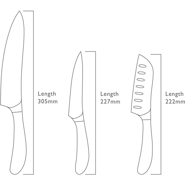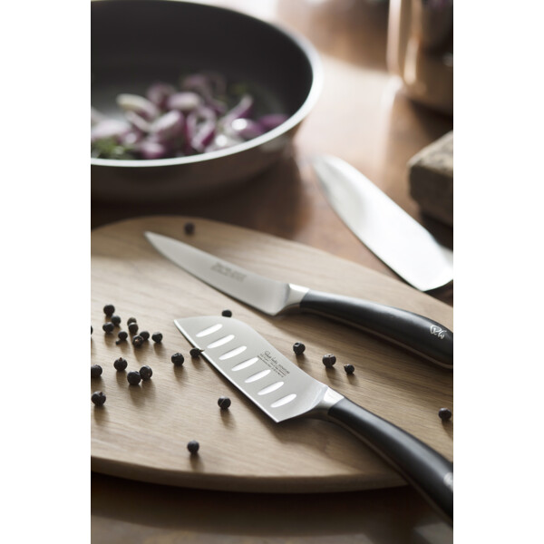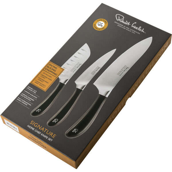 Robert Welch Signature Hjemmekokken 3-delt knivsæt, som indeholder en 11 cm Santokukniv, en 12 cm Universalkniv og en 18 cm Kokkekniv.