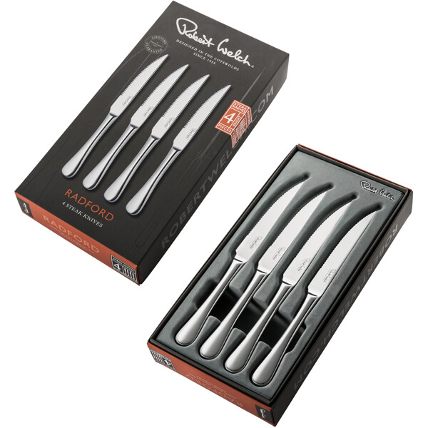 Et 4-delt steakknivsæt i gaveæske fra den tidløse Radford Bright-bestikserie. Fremstillet af specielt hærdet rustfrit stål med en spejlpoleret finish. Radford Bright-bestik fremhæver enhver borddækning med sit klassiske design og alsidighed. Radford-serien er flerfoldigt prisbelønnet, består af over 80 dele og er den største bestikkollektion i rustfrit stål i verden. Radford Steakknive kommer i en flot gaveæske, er opvaskemaskinesikre og har livstidsgaranti.
