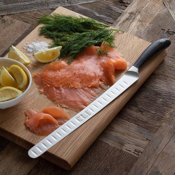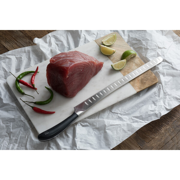 Robert Welch Signature Trancherkniv fleksibel 30 cm er fuldt smedet med tysk DIN 1.4116 rustfrit stål og med en fyldt kerne for ekstra styrke. Med sit lange, tynde blad gør Trancherkniven det muligt at skære fine skiver af kød, fjerkræ og fisk smidigt. Trancherkniven har et ergonomisk DuPont™ håndtag.