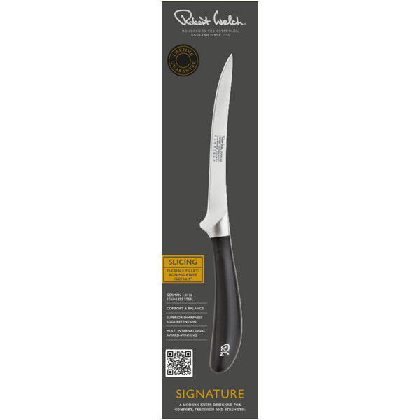 Signature Filetkniv fleksibel 16cm har et smalt blad og spids top til præcisionsudbening af kød, fjerkræ og fisk. Fremstillet af tysk rustfrit stål med et ergonomisk DuPont™ håndtag. Alle Robert Welch Signature knive leveres i flot gaveæske, kan vaskes i opvaskemaskine og har 25 års garanti.