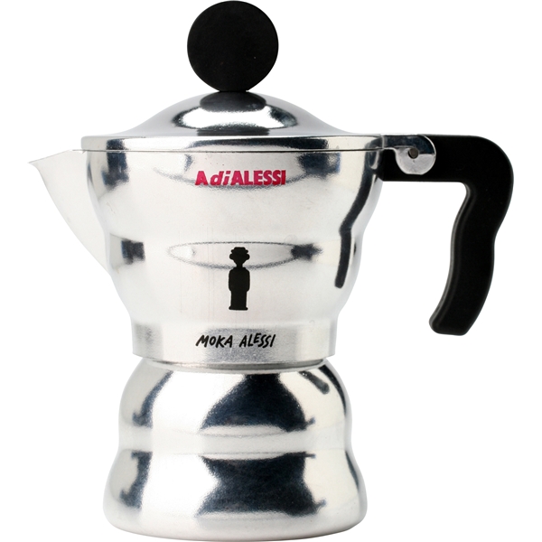En populær Moka-serie som blev skabt af farfar Alfonso. Espressokaffe til kun 1 kop = 7 cl, 3 kopper = 15 cl eller 6 kopper =30 cl. Det er dig der bestemmer hvad der passer bedst! Espresso-maskinen er fremstillet i støbt aluminium og har håndtag og knop i sort termoplast. Designer: Alessandro Mendini.Fungerer ikke på induktionskomfur.