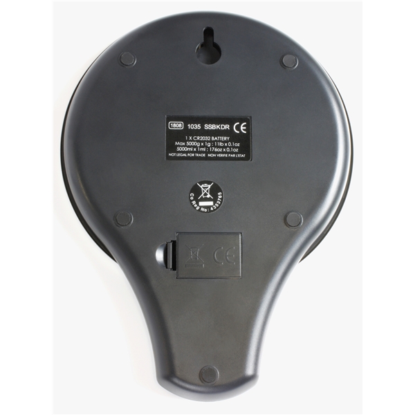 Vej ingredienserne direkte på vægten eller brug din egen skål. Hygienisk og nem at rengøre. Vælg mellem metriske og britiske mål, 5 kg (1 g) Tare. Let at aflæse med LCD-display. Kompakt for enkel opbevaring på køkkenbordet eller på væggen. Kapacitet: 5 kg / £ 11. Litium CR2032-batteri (medfølger). 15 års garanti.